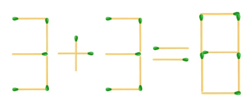 Пред очите ми е едно неправилно равенство, съставено от съвпадения: 3+3=8. Изглежда почти невъзможно да го поправиш, ако не можеш да премахнеш или добавиш нищо. Има обаче решение и то съвсем не е очевидно.