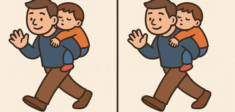 И така, готови ли сте за следващото предизвикателство? Вгледайте се внимателно в двете изображения на мъж, който носи бебе на гърба си. На пръв поглед те изглеждат еднакви, но има три малки разлики. Мислите ли, че можете да откриете всички тях за 19 секунди? Опитайте и проверете остротата на зрението си!