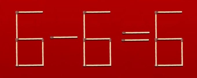 Този бърз IQ-тест предлага да поправите неправилно математическо равенство, като направите само едно движение. Примерът пред вас е 6 – 6 = 6, съставено от 21 числа, което все още няма логически смисъл. Задачата е да преместите само едно съвпадение и да превърнете равенството в правилно.